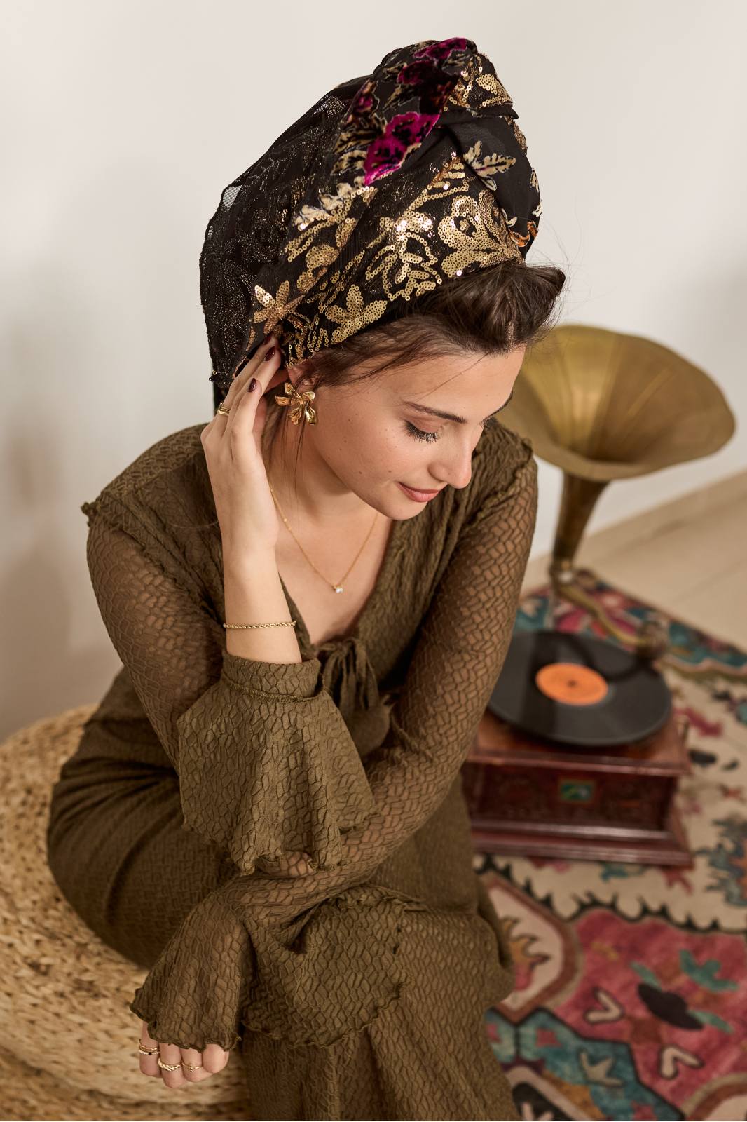 קטיפה צרובה בגוונים עשירים ואלגנטים בשילוב פייט שחור וזהב.