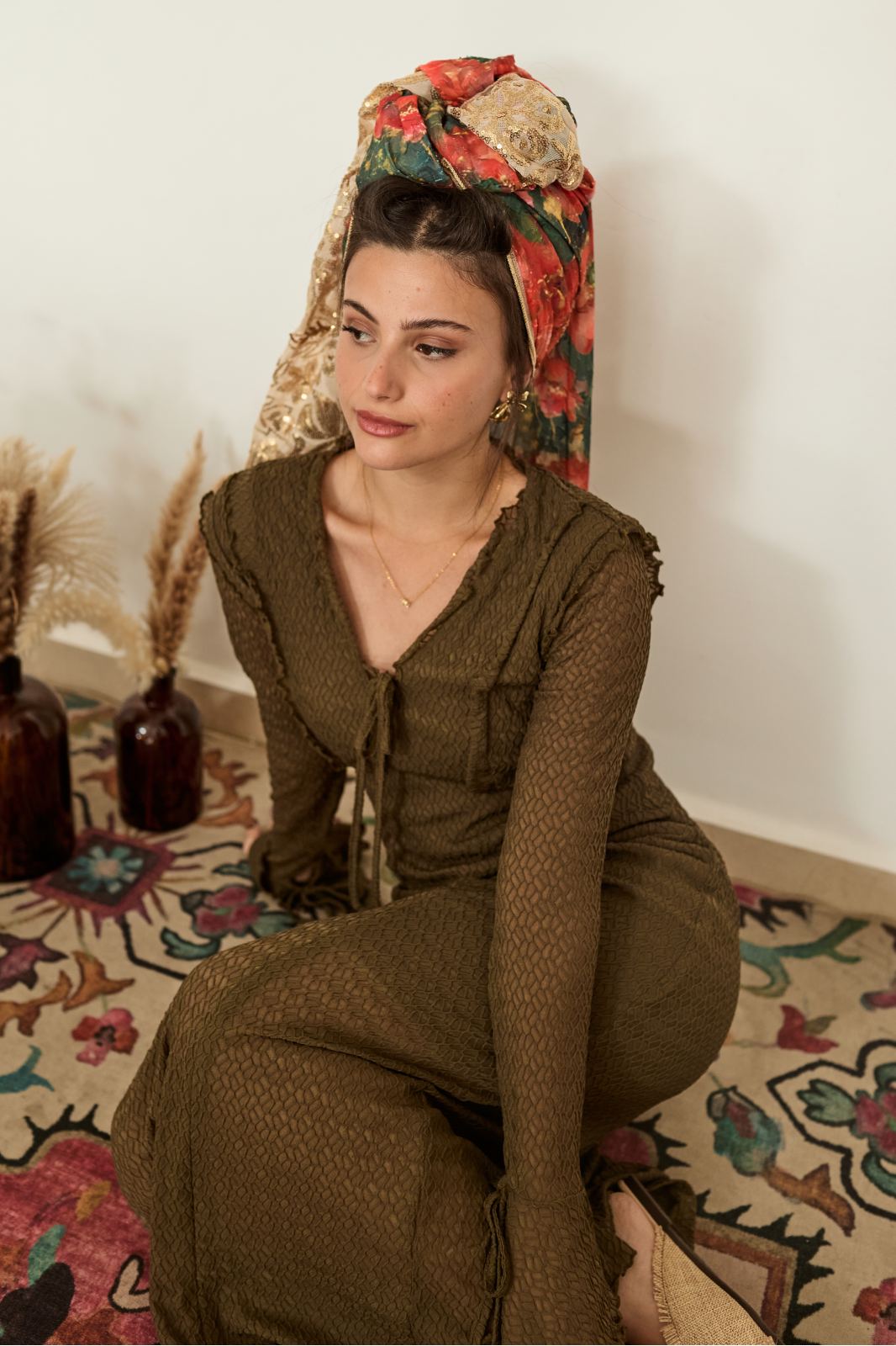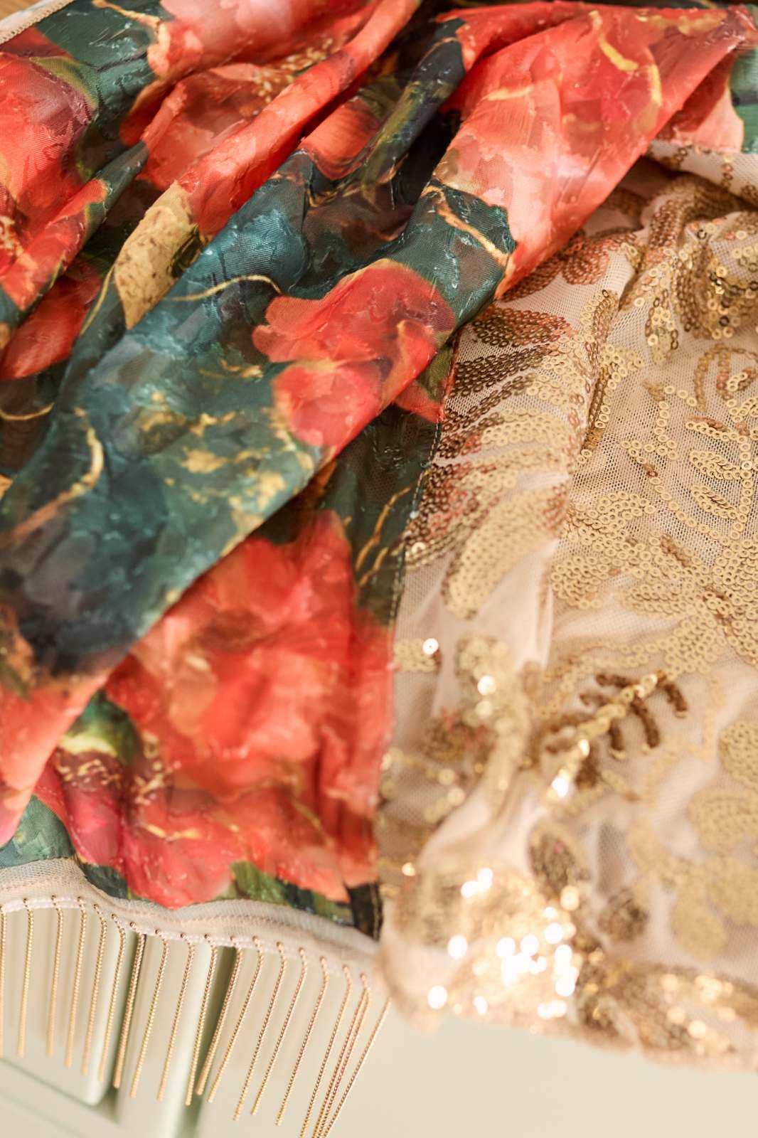 גוונים עשירים של ירוק וכתום עם פייטים זהב,