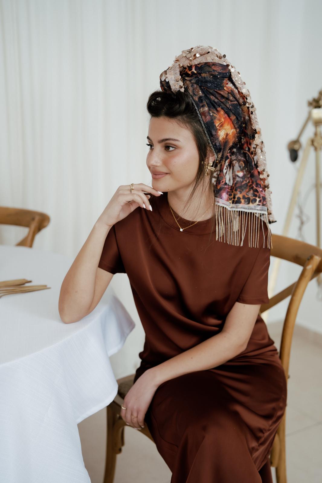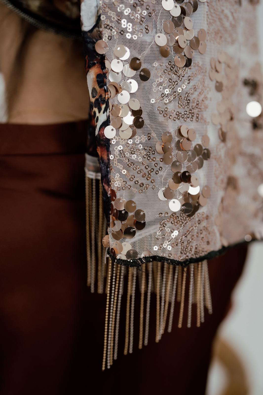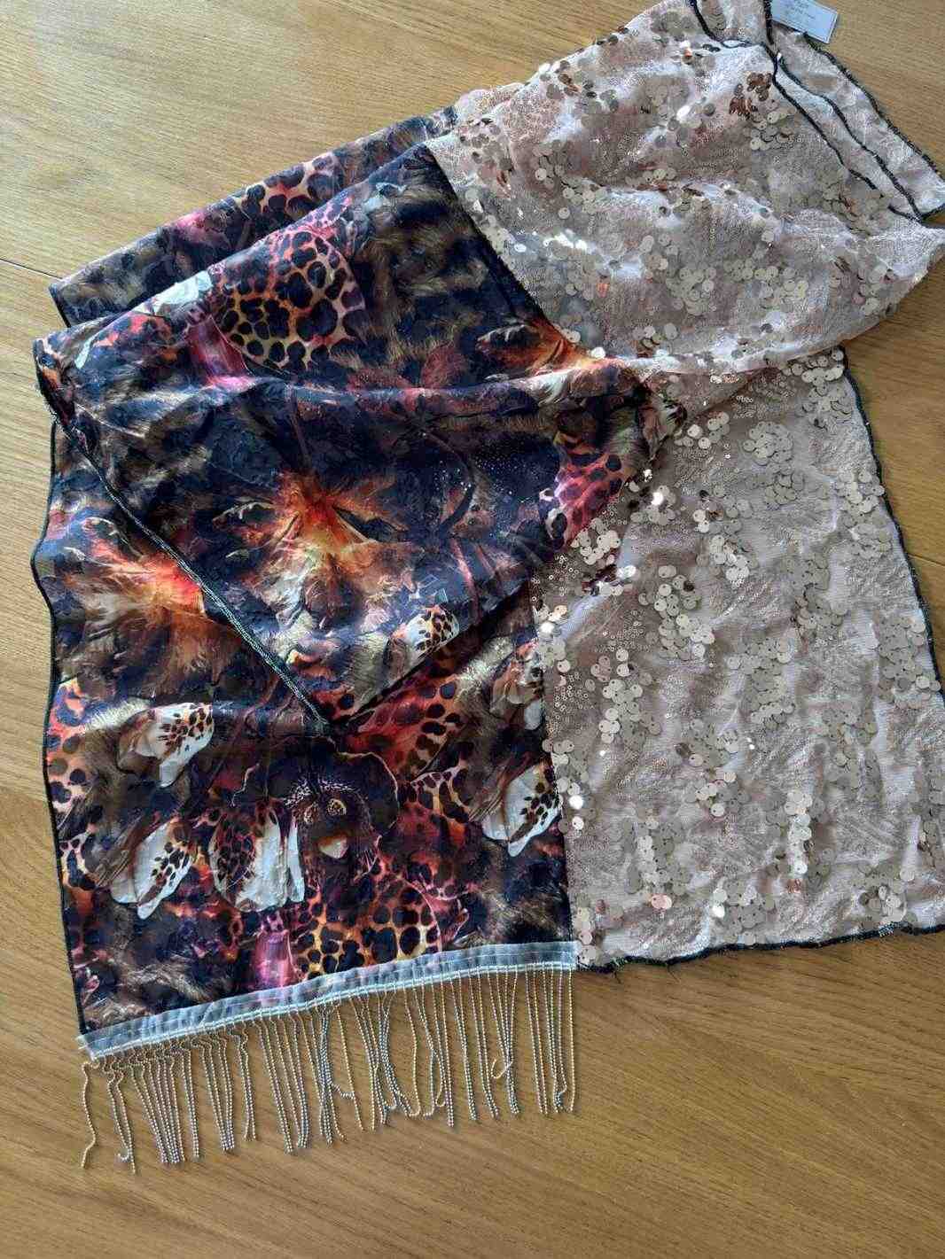הדפס יפייפיה, אלגנטי ומרשים יחד עם בד פייטים עדין וייחודי בגוון אפרסקי.