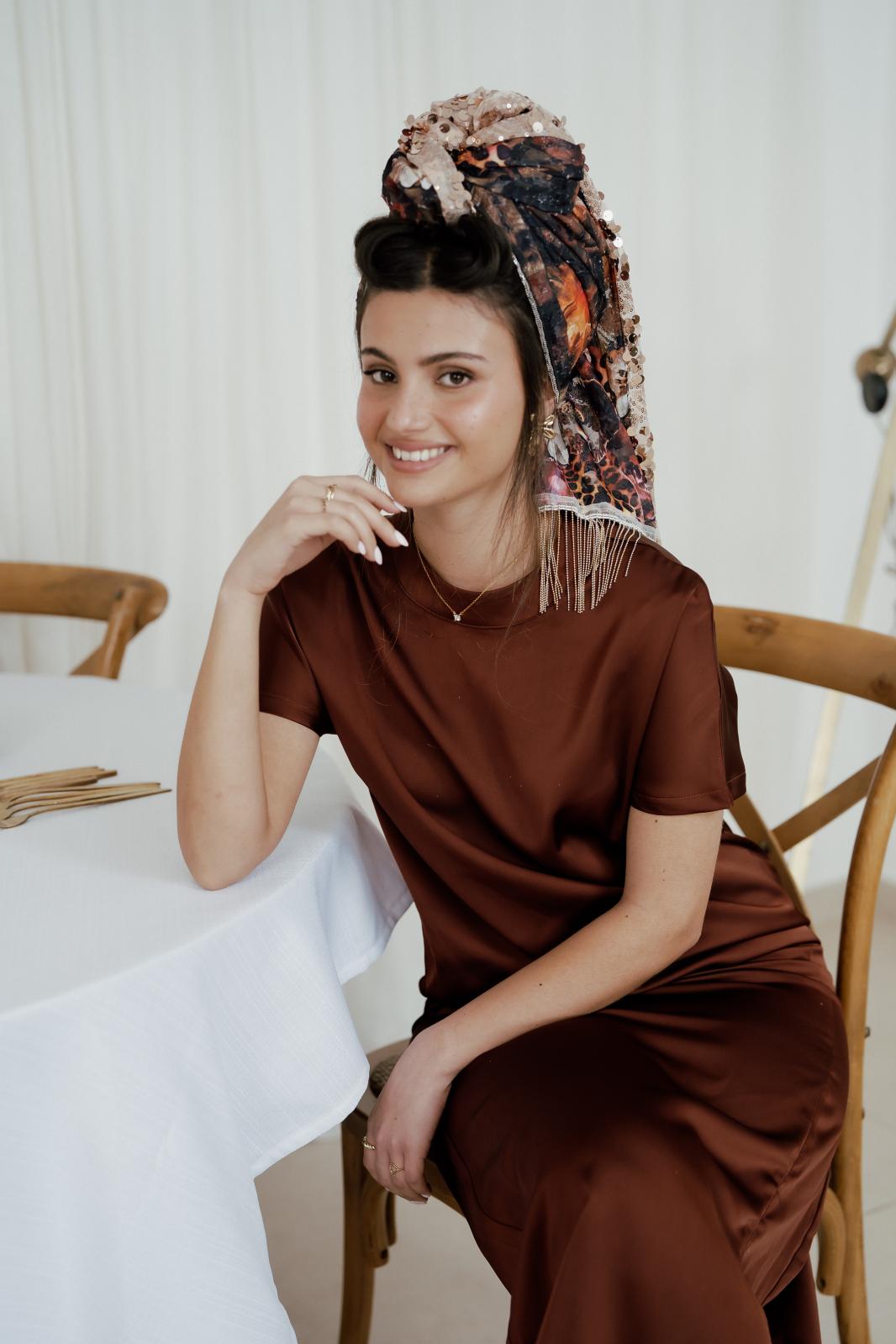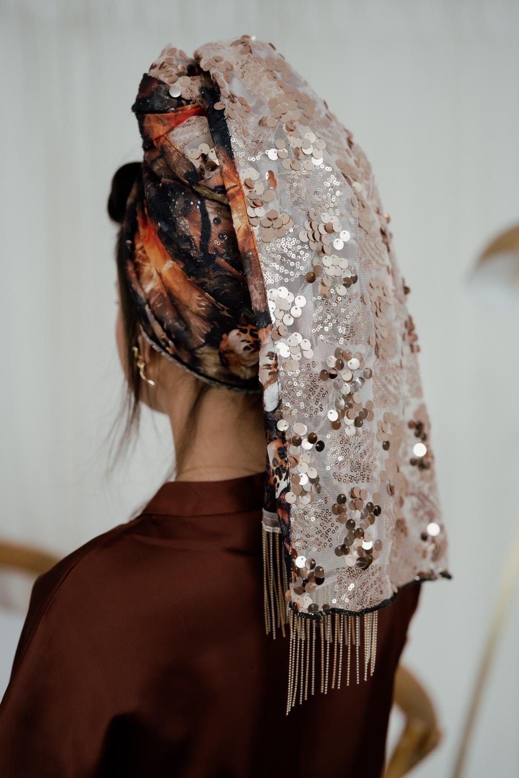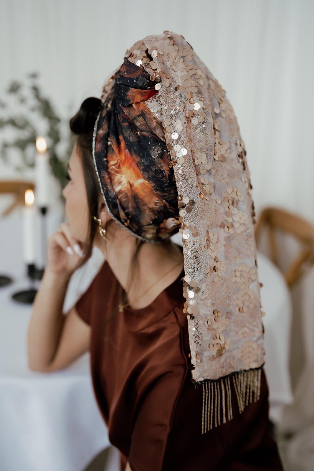 הדפס יפייפיה, אלגנטי ומרשים יחד עם בד פייטים עדין וייחודי בגוון אפרסקי.