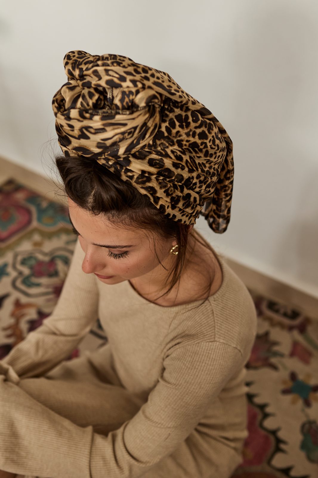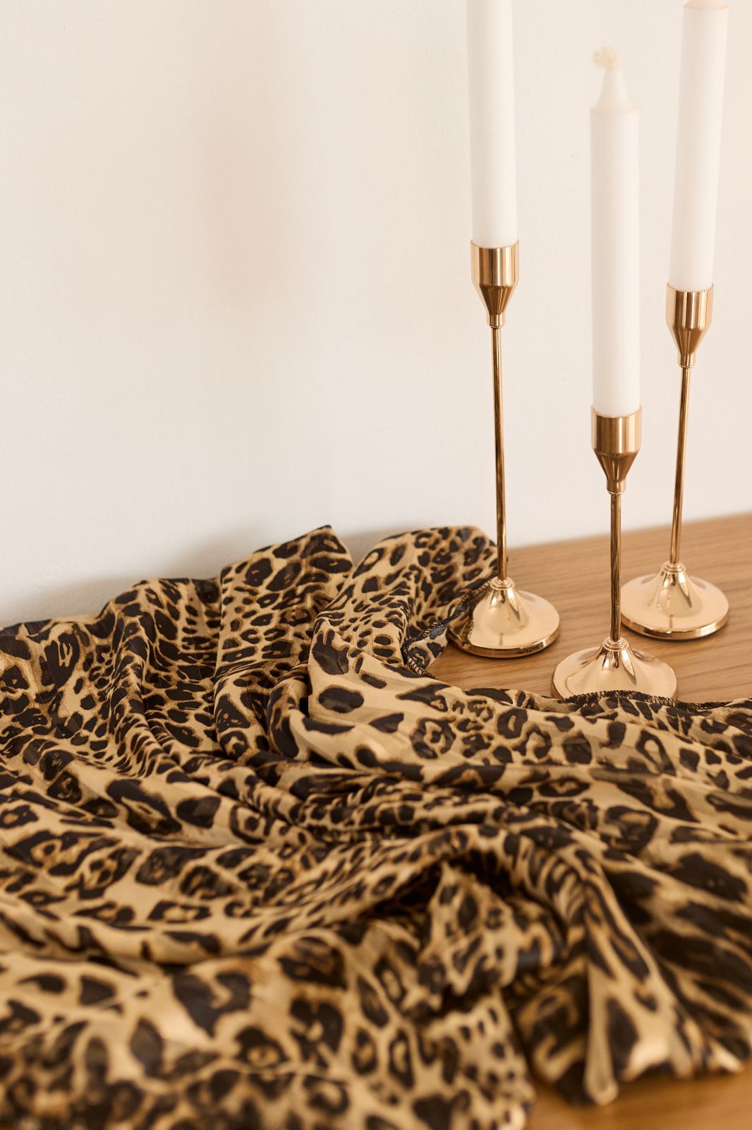 בד שיפון רך ודק בהדס מנומר עם פסי זהב עדינים לכל אורך המטפחת.
