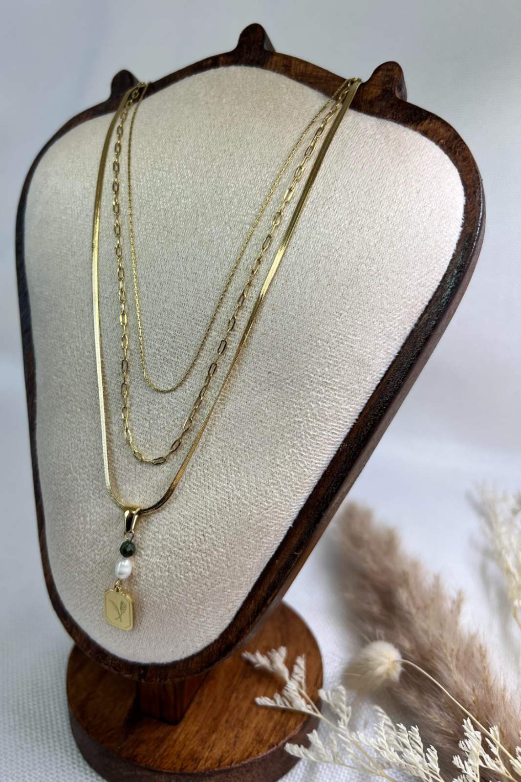 שלוש השרשראות יוצרות מראה עדין ושלם.